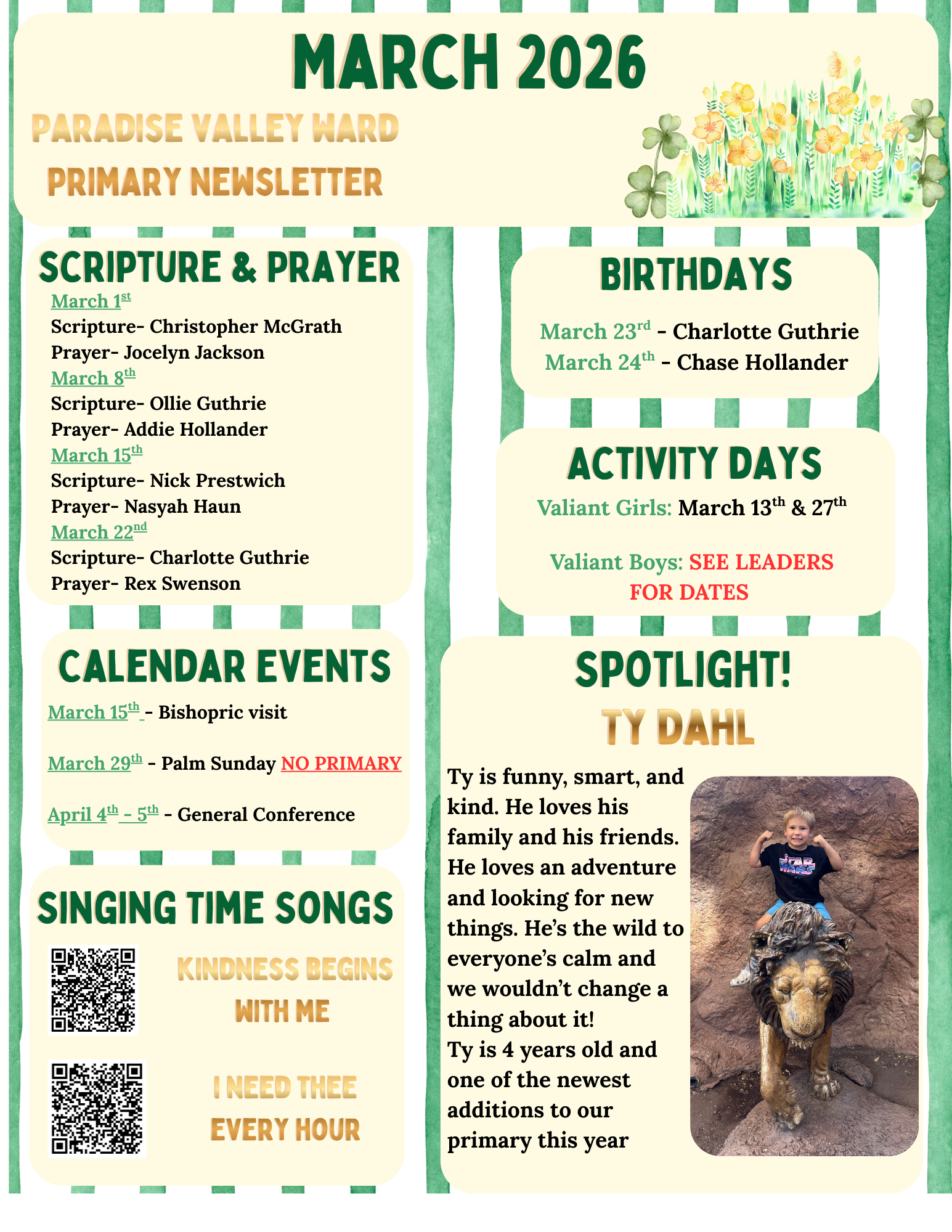 Read about Singing Time songs, Scripture & Prayer assignments, children spotlights, birthday celebrations, Activity Days updates, and uplifting reminders. Don't miss out and check it out today!